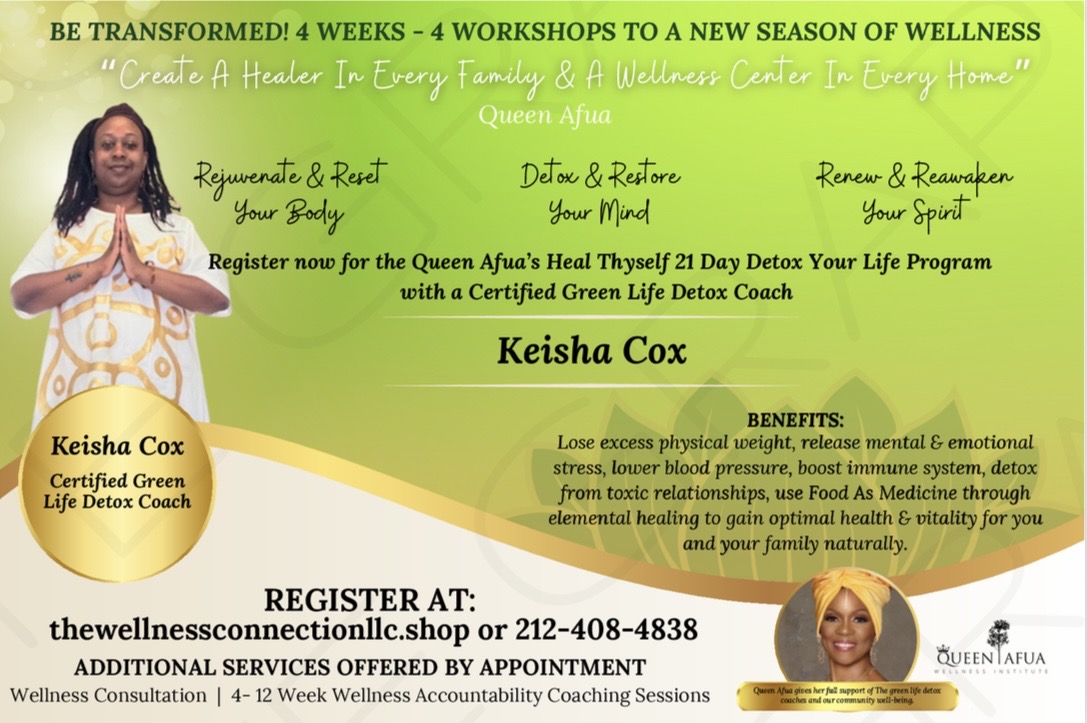 Hello, I'm Keisha Cox, your guide on this transformative wellness journey. As a certified Green Life Detox Coach, I am dedicated to sharing my knowledge and experience to help you achieve optimal health. Join me in this empowering course, and together, we will pave the way to a healthier and happier lifestyle.